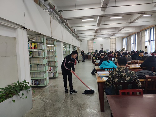 在五楼的清洁小组中,五位男生五位女生可谓是“男女搭配,干活不累”。男生负责用拖把清洁地面,女生则负责用抹布擦洗书架。男生们沉默地拖洗,从每一小块到各个区域,从楼下到楼上,愈渐干净的地面体现了他们的认真细心。女生们在书架中穿梭,眼神从书架上扫过,手执抹布擦拭灰尘,一层层,一列列,每一个死角都不放过。化二班男生们弯腰认真拖洗的身影,女生们或蹲下或踮起擦洗书架的身影,与图书馆中读书学习的众多身影一起构成了这个下午美好的画面。