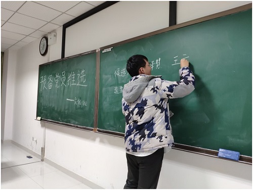 在同学们都到齐之后,王元同学宣布活动开始,并宣读本次推选的一些规则和要求。他说:“共青团是党的助手和后备军,是广大先进青年的群众组织,将青年中的优秀分子推荐给党组织作为预备党员是团组织的责任和义务。希望同学们能够踊跃参与这次活动并诚实诚信地参与推优工作。而想要在此次成为预备党员,有党课考试通过、在2018年10月1日前满18周岁(最低要求)、无挂科记录及违纪记录等要求。此次活动旨在响应学院与年级的号召,在本班选出2到3名预备党员。”在之后的自由发言时间里,符合条件的且报名的同学分别上台发言。
