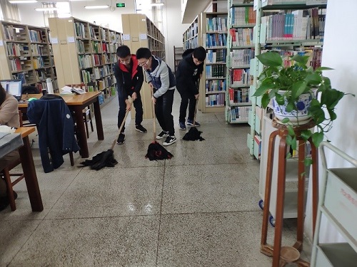 由于三个楼层的文献借阅室都配套有相应的自习教室,每天都有许多来自上自习的同学。但与此同时,地上显得有些脏,书架上的书也有些散乱。所以在此次志愿活动中,同学们的主要工作是整理书架上的书籍、清理书架上堆积的灰尘以及地面的清洁。