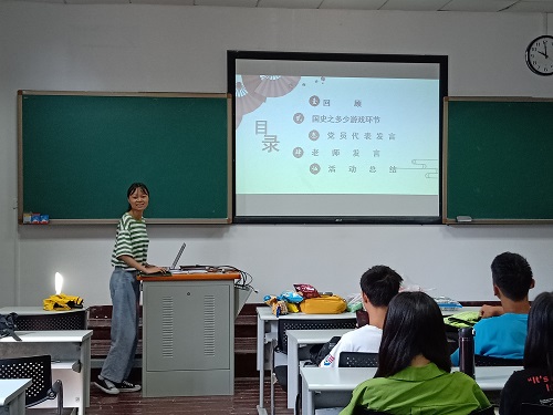 影片观看结束后,激动人心的游戏环节开始了。第一个游戏是历史竞猜30问,班级同学分为4个小组,每个小组随机抽一份有关中国历史文化知识的题目,在5分钟内作答,最后收取答卷,按分数从高到低分发奖品,小组内部讨论激烈,答卷分数也不相上下。第二个游戏是知识抢答,现场气氛十分热烈,同学们都怀着极大的热情参与抢答,对问题的答案争论不休。抢答题题目多种多样,同学们从中学到了不少新知。第三个游戏是红歌比赛,团支书挑选了许多经典的红歌金曲,采取接歌词的形式进行游戏,杜佳俊同学和邹克然同学表现非常优秀,两人之间难分伯仲。之后,由杜佳俊同学作为党员代表发表讲话,他从“中国梦”、讲起,谈到了中国文化输出,历史上民族进程,新中国的伟大事业等等,增长了同学们的见识。
