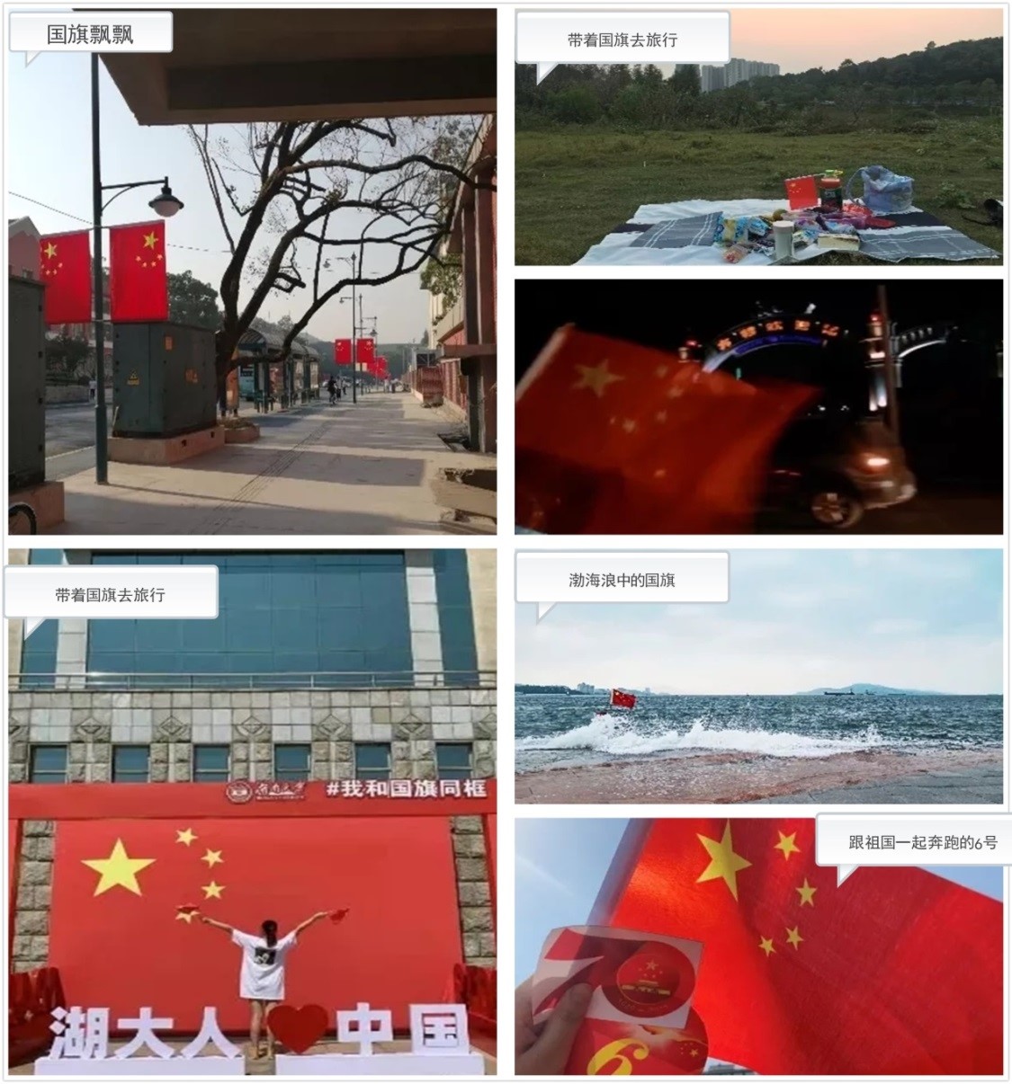 为深入学习贯彻习近平新时代中国特色社会主义思想,庆祝新中国成立70周年华诞,10月3日至10月10日,开云kaiyun官方网站研究生会重磅推出“我和我的祖国”特别征集活动,活动分为两个板块:“带着国旗去旅行”和 “声影中的家国情”,鼓励化工院全体硕博士研究生在国庆外出旅行途中、湖大校园内带有国旗的瞬间定格下来,以及国庆档观影后的所思所想进行投稿分享,共同为祖国庆生!