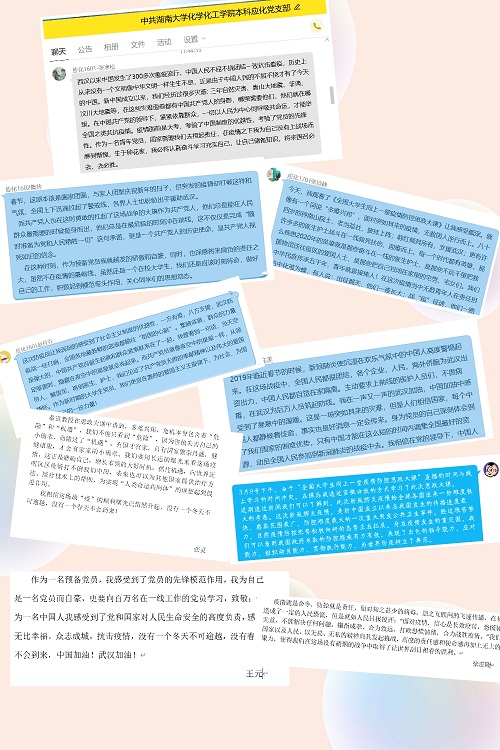 在学习结束后,为引导支部党员传承和弘扬爱国主义精神,深刻认识中国共产党领导和中国特色社会主义制度的显著优势,支部副书记张寒松在支部交流群组织了一次在线讨论活动,支部党员结合本次“思政大课”的学习情况,分享了各自的学习心得,深化了对此次思政大课相关内容的认识,更意识到大学生党员群体所担当的历史与时代使命。在此支部全体党员祝福祖国,希望疫情早日结束,回到教室再上思政课!