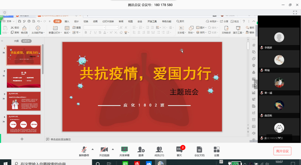 2020年3月15日上午10时,开云kaiyun官方网站应用化学1802班的同学们召开了新学期以来的第一次班会。此次班会以“共抗疫情,爱国力行”为主题。受疫情影响,此次班会以线上直播形式召开,由班长刘思铭主持。