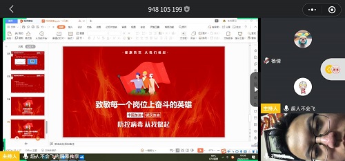 本次班会的主题——共抗疫情,爱国力行。班会旨在向同学们展示疫情期间中国所体现的大国风采以及医护工作者大无畏的奉献精神的同时,让同学在此特殊的日子里,做到全面防护,保证自己的身心健康,合理安排时间,停课不停学。