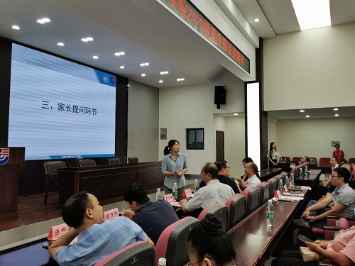 会议第二项是学院院长张晓兵教授发言,张院长以自己多年的学生生活和为人师、为人父的经验跟家长们阐述大学教育的特点,详细具体地向大家介绍了学院的历史传承和文化积淀,也向大家展示了学院雄厚的教学实力和师资力量,通过大量的数据分析展示学院本科生教学培养的实力和质量节节攀升。