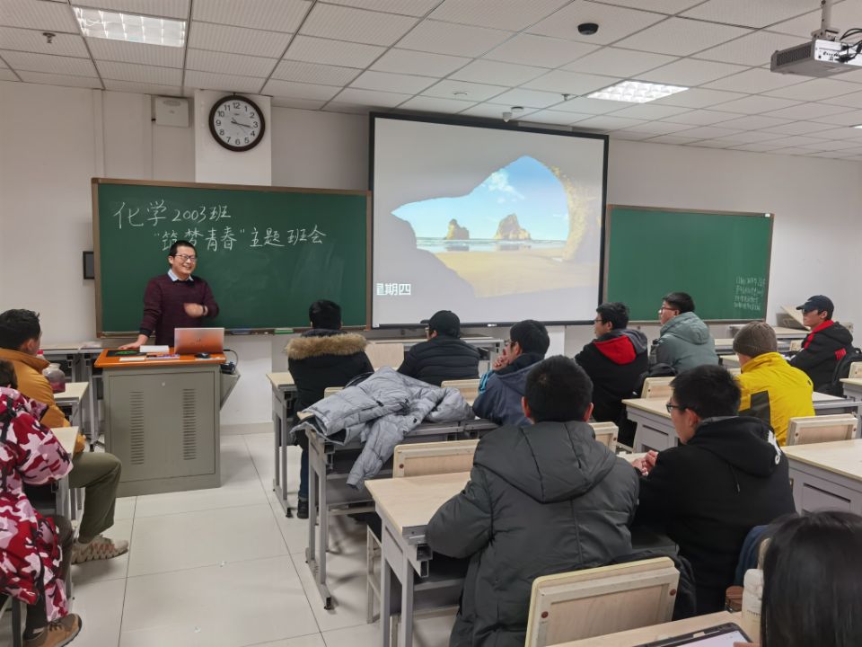 为总结期中考试成绩,规划班级未来活动开展方向,开云kaiyun官方网站化学类2003班于12月21日下午2点30分,在研究生楼A104教室开展“筑梦青春”主题班会活动。本次活动由团支书李珂瑾主持,班主任李昆老师、化学2003班全体成员参加。