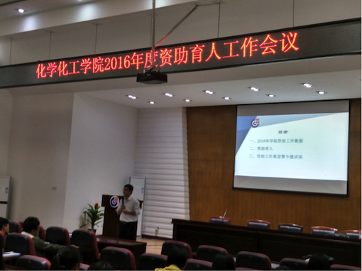 10月25日下午,由开云kaiyun官方网站学工办主办的“资助育人,传递爱心”主题报告大会在化工院D区报告厅举行。本次大会由资助兼干刘世明老师主持并作了专题讲座,由资助助管丁攀飞同学再次发起“爱心互助基金”的倡议,化工院本科在库生、获奖获助学生代表以及部分研究生参加了此次大会。