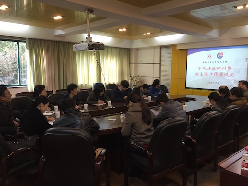 会议之初,党委副书记陈义红老师对学院各个年级整体情况进行了简单介绍,并对各年级所存在的问题进行了梳理和剖析。对于班导师的定位,蒋健晖教授强调了班导师对学生的引导作用,引导本科学生加强对科研的追求与上进心;王玉枝书记则提出了班导师们需要四心:热心、用心、耐心、良心,以及以学者身份传播正能量,做好学生学风学业及人生规划上的引导。