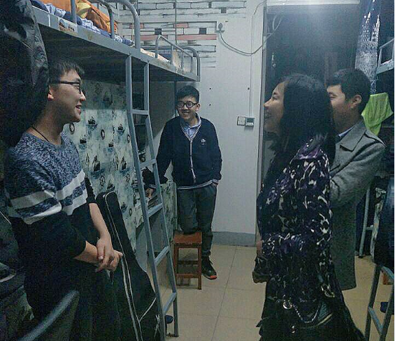 晚上八时,学院领导老师和同学们相约在天马篮球场,进行简单的分组后,16级辅导员陪同王书记走访新生寝室,13级辅导员陪同陈书记走访毕业生寝室,其余班导师深入对应班级寝室看望学生。王书记检查了新生宿舍卫生情况,并与同学们进行亲切交谈,她要求大家要保持寝室内务水平,注重寝室氛围的营造,鼓励大家团结向上,积极营造浓厚的寝室学习风气,促进共同进步。看到部分同学衣着单薄,王书记热情地叮嘱大家注意天气变化,保重身体。