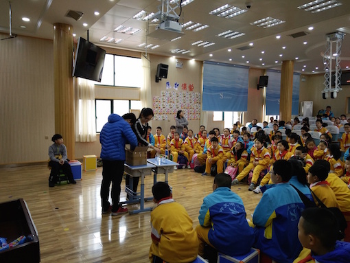 前往樟树门的志愿者们在2:20左右到达该小学,负责人刘老师安排了四年二班的学生和大家一起上这节实验课。上课时,志愿者开头先以“坐地日行八万里”的奇妙诗句引起学生们的兴趣,引出了地球自转的知识。之后志愿者又借由 “像你们这么大的小学生在干什么?”的问题引出了墨子小时候做的实验,为学生们介绍了照相机小孔成像的原理。小学生们勤学好问,志愿者们耐心讲解,现场气氛活跃和谐。