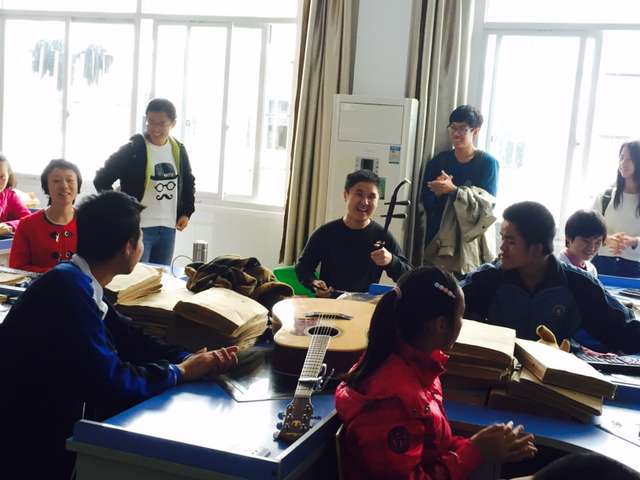 体育课结束,化学1402班的同学本想上前扶助他们回教室,被班主任婉拒了,她说,“今后老师和父母不能一直守在他们左右,这些事情需要他们自己完成,他们也可以做到,他们对学校的路很熟悉了,你们只要跟在后面就好。”5分钟后,他们到达了孩子们所在班级,一场小小的见面会正式开始。首先是自我介绍,然后,既是见面会,才艺表演自然少不了,化学1402班张博韫同学用吉他弹唱了一首《故乡》,孩子们也不甘示弱,一首《有形的翅膀》甜美嗓音让时间定格;一曲二胡《赛马》热烈奔放颇具大师风范,化学1402班王佳敏同学一曲《My Heart Will Go On》震压全场,孩子们和哥哥姐姐们展开了大比拼,表演一个接着一个,还有表演长笛的少年,虽有些生硬,但对前几天才开始自学的他却是很了不起,小小的教室掌声雷鸣,孩子们才艺令人震撼。第一节课在愉快的氛围中结束了,在第二节课上,孩子们表示中学化学太难,于是化学1402班的南斌同学对他们进行了辅导,主要讲了化学方程式的配平,一节课下来,他们在化学上的小小进步也让我们很是欣慰。他们看不了普通课本,只能用手一遍一遍摸着盲文课本;他们也没法打草稿,所有计算都只能靠心算,即使困难重重,也丝毫不减他们对学习的热情。最后,应孩子们请求,南斌同学甚至将近代史搬上了讲台,讲起了李鸿章的故事,孩子们也听得入迷,听完了还觉得不够,直喊着再来一个,要听水浒传和三国演义。
