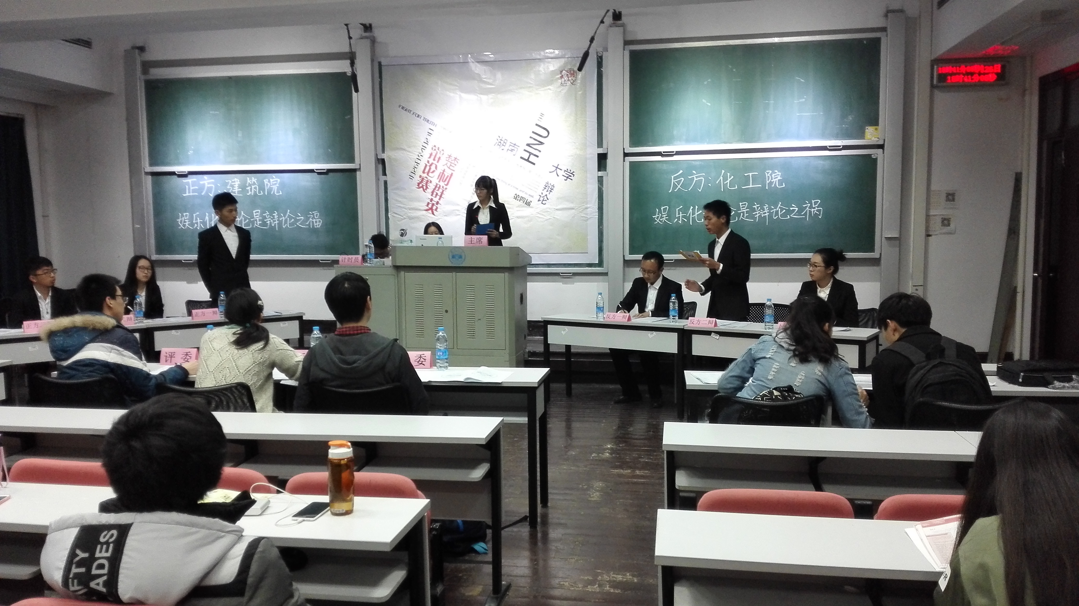 2016年3月26日晚上六点半,第四届麓山会讲•楚材群英辩论赛在中楼举行。中楼106举行的辩论赛是由正方建筑学院对阵反方开云kaiyun官方网站,辩题是娱乐化辩论究竟是辩论之福还是辩论之祸。