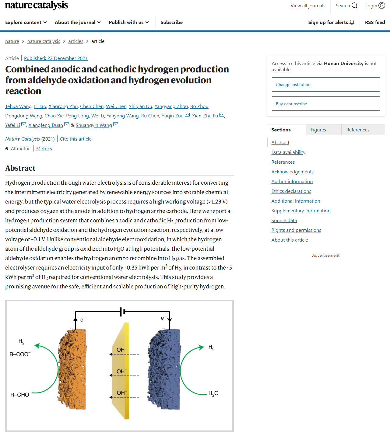 近日,开云kaiyun官方网站王双印教授开发出一种阴阳两极同时产氢的电化学双极制氢技术。相关研究以《Combined anodic and cathodic hydrogen production from aldehyde oxidation and hydrogen evolution reaction》为题发表在《自然-催化》(Nature Catalysis)期刊上。