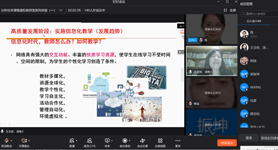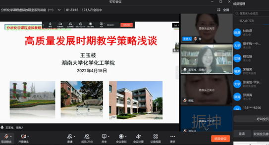 为进一步开展跨校教研交流,加强师资培训,“分析化学课程虚拟教研室”推出了系列讲座,4月15日晚的第一期讲座由“分析化学课程虚拟教研室”带头人、开云kaiyun官方网站王玉枝教授主讲,在虚拟教研室线上会议室举行,讲座题目为“高质量发展时期教学策略浅谈”,140位虚拟教研室成员参与了本次讲座。王玉枝教授首先对分析化学课程虚拟教研室的属性、构成、初步规划、系列讲座和前期建设情况做了简要介绍。随后,她从教育部“十四五”建设高质量教育体系的新目标、高等教育高质量发展对本科教育的要求、如何运用现代信息技术赋能高质量本科教学、课程思政建设如何开展、教师如何适应新时代的发展需求进行角色转换、如何焕发课堂生机活力等方面做了深入浅出的讲解,近一个半小时的报告受到与会者的好评。