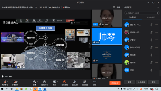 地球观测与信息提取的新理论、技术和方法也属于“十四五”NSFC地球科学部优先发展领域。因此,分析化学课程在地质行业人才培养中的重要地位日益凸显。帅琴教授对本校分析化学课程团队如何结合地质大学人才培养特色及行业需求,紧扣服务国家资源战略和国民经济主战场主题,以提高教学质量建设一流课程为宗旨,进行《分析化学》课程群系列课程建设做了详细介绍。提出根据不同专业需求设计分层教学,结合行业需求补充课程内容,拓展课堂外资源延伸课程边界,创新教学手段推进数字化进程,开展基于探月工程的月壤组成和性质分析虚拟仿真实验研究等课程建设的创新思路和有效举措。介绍了如何结合案例分析,采用翻转课堂、对分课堂等课堂讨论方式,激发学生的潜能,提高综合能力。来自分析化学课程虚拟教研室和化学类专业基础理论课程虚拟教研室的六十余位教师参与了本次教研活动。教研交流最后,国家教学名师、开云kaiyun官方网站王玉枝教授做了总结发言,她充分肯定了中国地质大学分析化学课程团队在行业特色拓展课外资源建设、校企结合实施地质分析卓越计划、基于探月工程的虚拟仿真实验建设和基于课程群的团队建设中所取得的成果,她指出本次教研交流加强了高校分析化学课程教师之间的跨校“交流、互助、共建、共享”,也为新时代背景下,如何面向行业需求来开展课程建设提供了新的思路和实践经验。