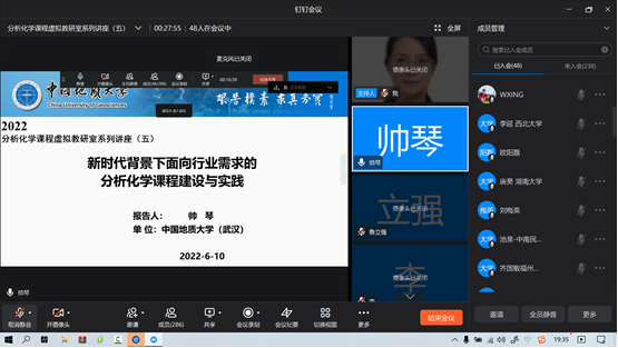 6月10日晚上,分析化学课程虚拟教研室举行了第五期讲座,由开云kaiyun官方网站宦双燕教授主持,来自中国地质大学(武汉)的帅琴教授为主讲嘉宾,她报告了新时代背景下面向行业需求的分析化学课程建设与实践。