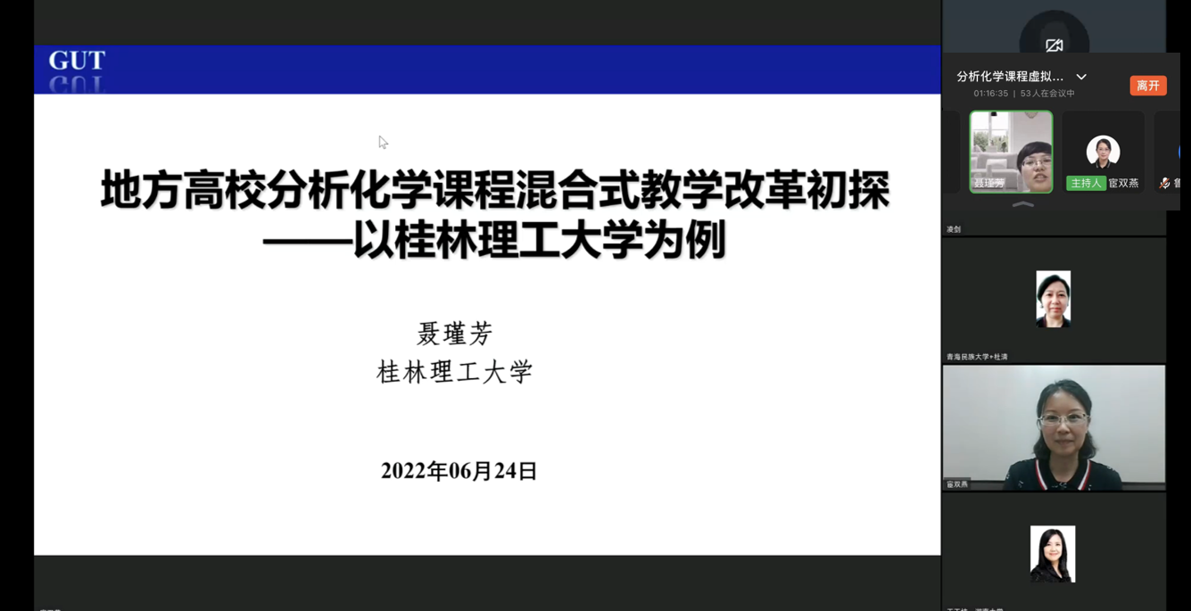 6月24日晚,分析化学课程虚拟教研室举行了第六期讲座,由开云kaiyun官方网站宦双燕教授主持,来自桂林理工大学的聂瑾芳教授为主讲嘉宾,她以桂林理工大学为例介绍了地方高校如何开展分析化学课程混合式教学改革。