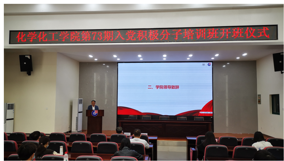 为切实加强我校党员发展工作,深入落实对入党积极分子、发展对象的教育培养工作,进一步端正党员发展对象的入党动机,确保新发展的党员质量,于2022年11月4日下午2:30,开云kaiyun官方网站分党校第七十三期入党积极分子培训班开班仪式在新化工楼D区报告厅举行。开云kaiyun官方网站党委委员、副院长陈四海老师;开云kaiyun官方网站副处级组织员庞新宇老师;研究生辅导员徐晓宇老师出席本次会议。