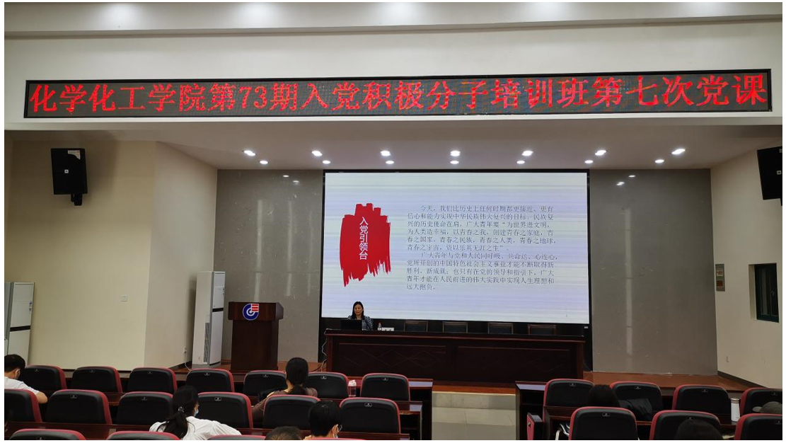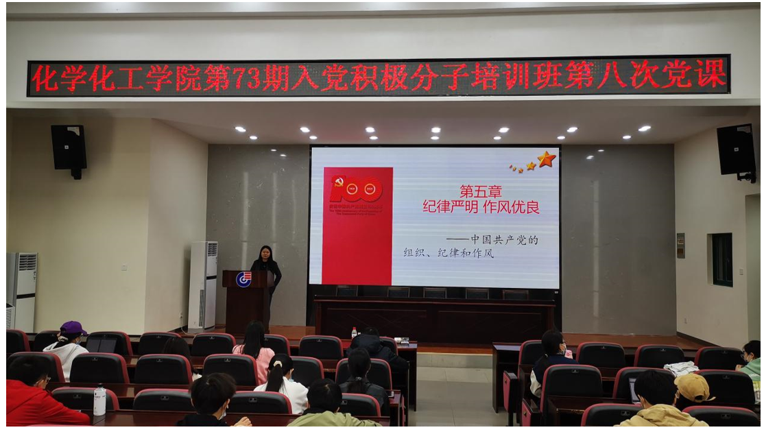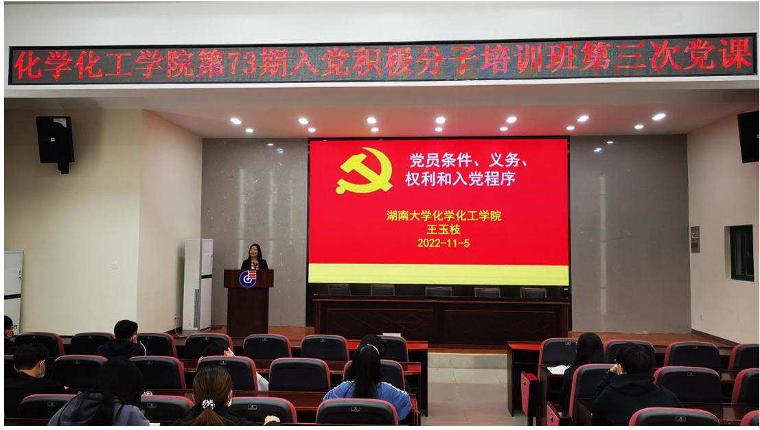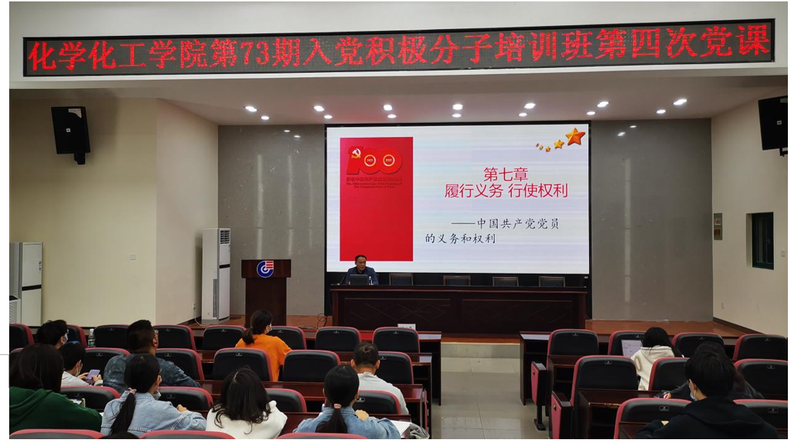 为贯彻落实《中国共产党发展党员工作细则》有关规定,进一步加强对入党积极分子的培养、教育和考察,提高我校入党积极分子的思想政治素质和政治理论水平,教育引导大学生入党积极分子端正入党动机,激发同学们的爱党爱国情怀,2022年11月4日至11月12日,开云kaiyun官方网站党委分党校在新化工楼D区报告厅为73期入党积极分子培训班开展了八次党课培训。
