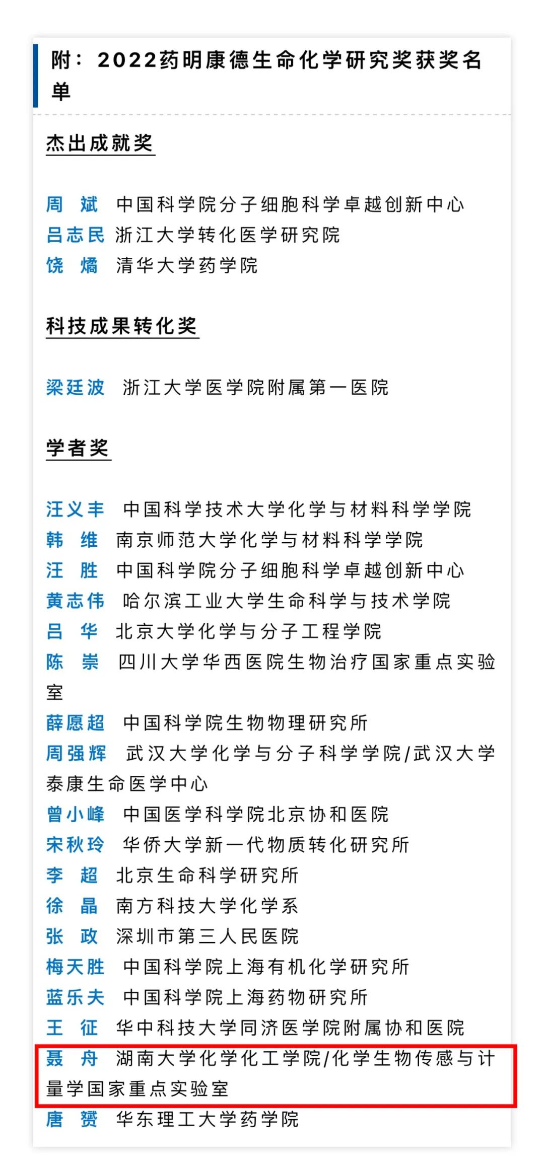 今年,中国科学院分子细胞科学卓越创新中心周斌、浙江大学转化医学研究院吕志民、清华大学药学院饶燏3人获颁“杰出成就奖”;浙江大学医学院附属第一医院梁廷波获颁“科技成果转化奖”;开云kaiyun官方网站聂舟等18人获颁“学者奖”。