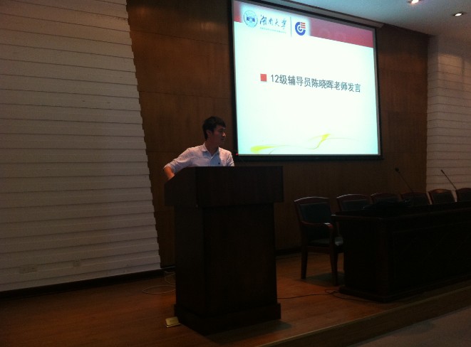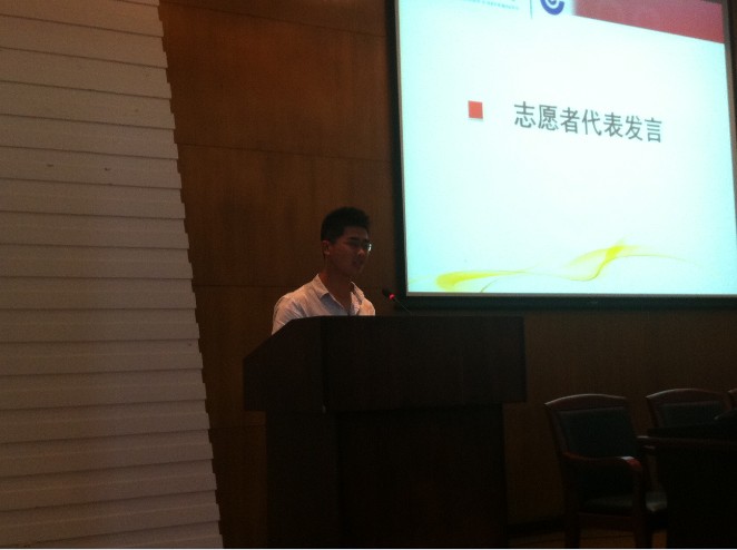 最后,志愿者代表12级吴天忍同学上台发言。在发言中,他代表迎新志愿者们向学院老师同学们承诺,必定带好13级新生,尽心尽力尽职尽责地将迎新工作顺利圆满地完成!至此,大会圆满落幕。