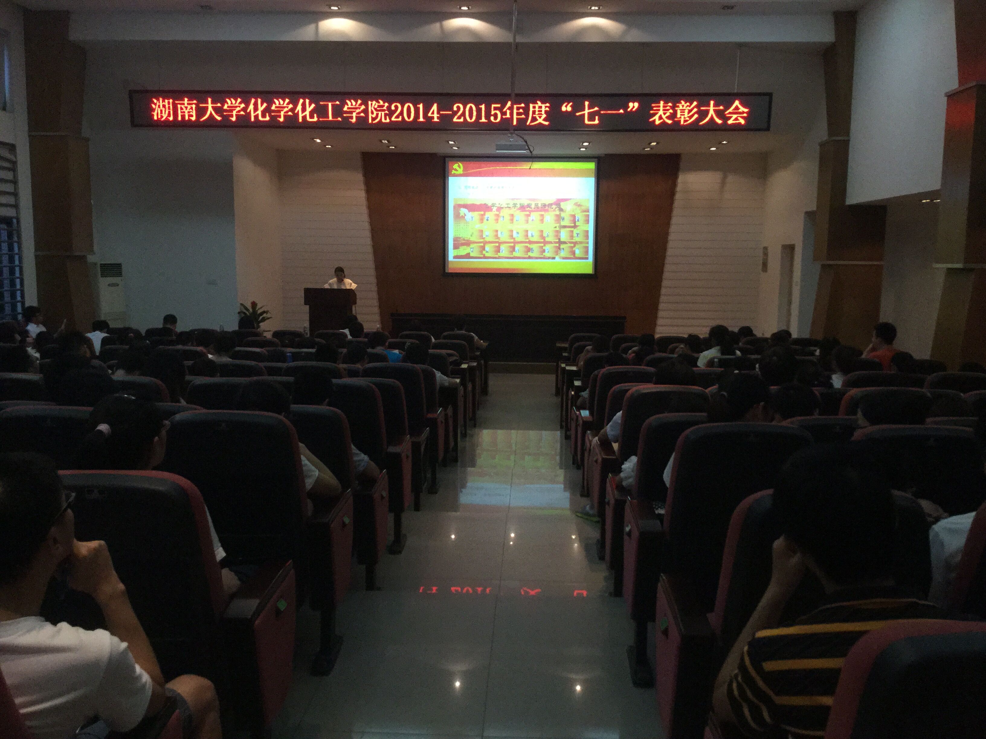 6月30日晚,在党的生日到来之际,开云kaiyun官方网站党委隆重举行了2014-2015年度“七·一表彰”大会,对本年度涌现出的一批学生党建先进集体和优秀个人进行表彰。应邀出席本次表彰大会的嘉宾老师有学院党委副书记陈义红老师,学工办主任曾芳老师,研究生辅导员刘卓老师,学院团委书记辅导员陈晓晖老师,辅导员李辰老师、曾芷兰老师、刘世明老师。同时,我院全体学生党员参加此次表彰活动,会议由朱天时同志主持。