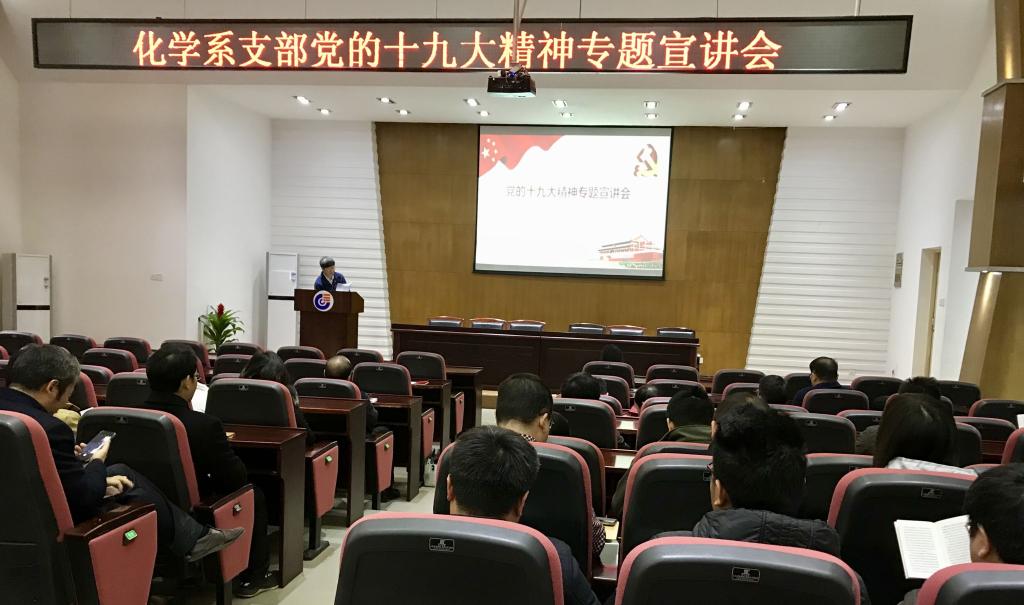 蒋健晖同志分别从会议主题,习近平新时代中国特色社会主义思想,过去五年取得的历史性成就,中国特色社会主义进入新时代的重大意义,我国社会主要矛盾变化的深远影响,“两个一百年”奋斗目标,坚定不移全面从严治党的重大部署等方面,为化学系全体党员系统阐述了党的十九大精神的丰富内涵。