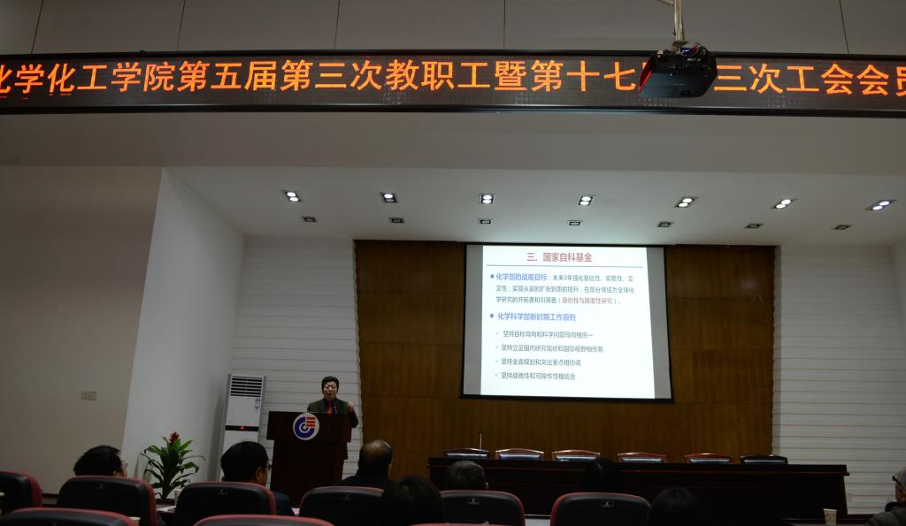 为迎战新一轮基金项目申报的挑战,我院于2018年1月10下午在化工院D区大会议室举行了申报动员大会,副院长尹双凤教授向全体教职工作动员报告。尹院长先回顾了本院2017年取得的科研成就,盘点分析了本院教师在过去三年申报与被资助的科研项目以及获得的奖励荣誉,也指出我院科研工作中存在的不足:主持大项目较少,国家级平台偏少,已有的科研平台利用不足,军工领域后继乏力,急需青壮年人才,与企业互动较少,亟待提升成果转化等问题。然后,以国家自然科学基金申报为例进行详细解读。化工院申报成功的基金项目集中在分析学科领域,在合成化学、化工应用等领域项目申报偏少、命中率低等短板。不足即是契机,我院教职工应该抓住本次基金委化学部改革的机会,以国家战略为导向发挥科研能力,突破既往局面,形成新的发力点。