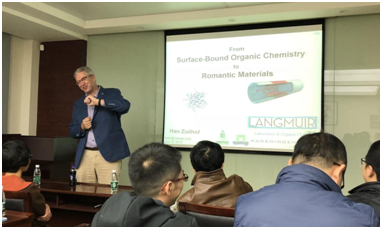 生命体中绝大多数的生化反应都发生在生物膜表面上,因此发展高效的材料表面功能化修饰方法在基础研究和应用研究领域都具有重要的意义。Han Zuilhof教授为我院师生介绍了他在表面修饰化学和点击反应等领域多年来的研究成果和最新研究进展。报告现场交流讨论活跃,全体师生们受益匪浅。这次讲座为我院相关师生提供了宝贵的经验,取得了良好的效果。