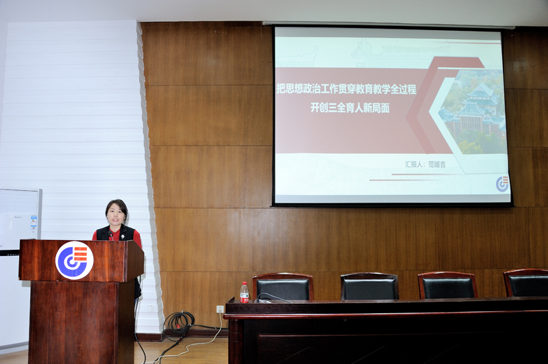 接下来学院党委副书记、纪委书记范媛吉同志以《把思想政治工作贯穿教育教学全过程开创三全育人新局面》为题,与全体参会人员一起认真学习了习近平总书记在全国高校思想政治工作会议上的讲话、习近平总书记在全国教育大会上的讲话和习近平总书记在学校思政理论课教师座谈会上的讲话等重要文件精神,并介绍了兄弟院校在思政工作方面一些好的做法和经验。