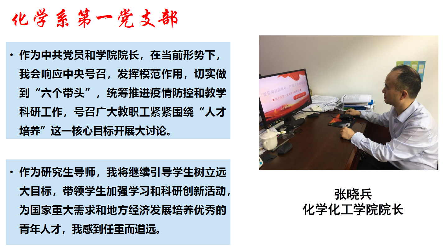 院长张晓兵表示:作为中共党员和学院院长,在当前形势下,我会积极响应中央号召,发挥模范作用,切实做到“六个带头”,统筹推进疫情防控和教学科研工作,号召广大教职工紧紧围绕人才培养这一核心目标开展大讨论。作为研究生导师,我将继续引导学生树立远大目标,带领学生加强学习和科研创新活动,为国家重大需求和地方经济发展培养优秀的青年人才,我感到任重而道远。