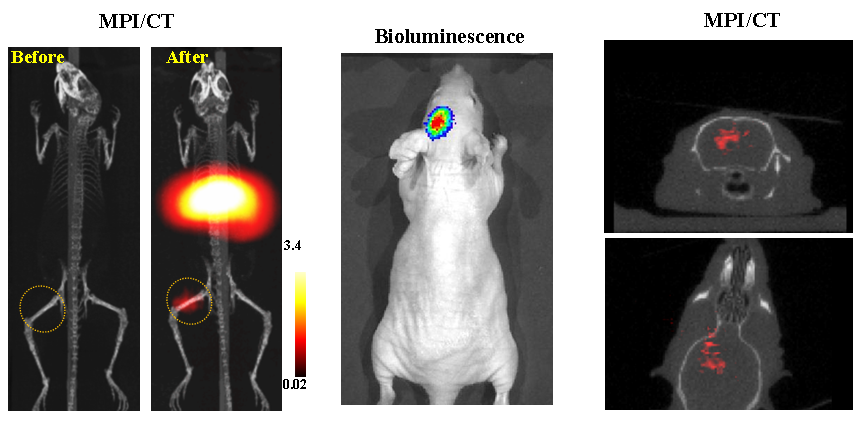 今年二月份,宋国胜教授与斯坦福大学饶江宏教授合作,通过系统的研究获得了影响磁性粒子成像信号的作用规律和关键原理,开发了新型磁性粒子探针---FeCo合金粒子,并首次应用于磁性粒子成像(MPI)。该造影剂在极低含量时(5 ng)仍具有很强的造影效果。这意味着,未来在进行人体成像时,可以使用更小剂量的造影剂,从而避免高剂量造影剂引起的肾肝损伤。基于MPI的直接成像原理,我们可以对造影剂进行正相和无背景干扰的活体成像,极大地提高信噪比。这项技术为肿瘤早期诊断、癌细胞示踪、脑中风、药物输送治疗、肺部灌注成像、胃肠出血、神经退行性疾病、磁热治疗等在活体中的可视化研究,提供了强有力的手段。相关研究成果以开云kaiyun官方网站为第一单位发表在Nature 子刊《Nature Biomedical Engineering》。该期刊是“生物医学工程”的顶级期刊。宋国胜教授为该论文的共同通讯作者。
