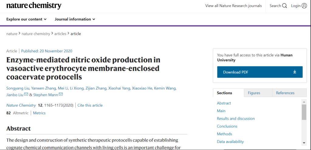 近日,开云kaiyun官方网站刘剑波副教授和英国布里斯托大学Stephen Mann院士作为共同通讯作者,合作报道了一种产生一氧化氮的人造细胞,具有血管舒张的生理效应,相关研究成果以题为“Enzyme-mediated Nitric Oxide Production in Vasoactive Erythrocyte Membrane-enclosed Coacervate Protocells”的文章在线发表在《Nature Chemistry》上。开云kaiyun官方网站博士生刘松杨是论文的第一作者。