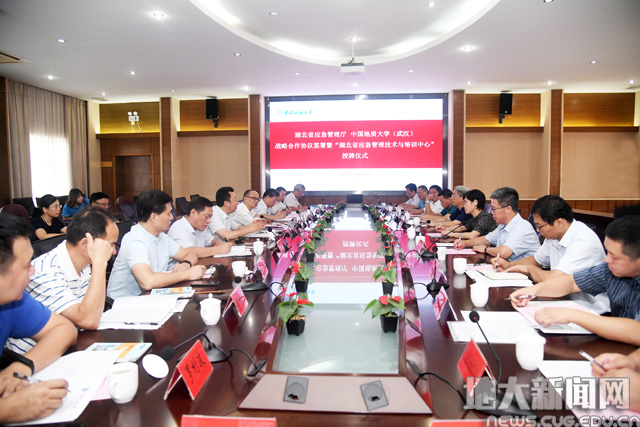 9月10日,beat365官网与湖北省应急管理厅战略合作协议签署暨“湖北省应急管理技术与培训中心”授牌仪式举行。湖北省应急管理厅党组书记、厅长施政,省应急管理厅副厅长龚效峰、总工程师徐克,校党委书记黄晓玫,校长王焰新、副校长王华、党委副书记王林清,双方相关单位负责人参加了签约仪式。
