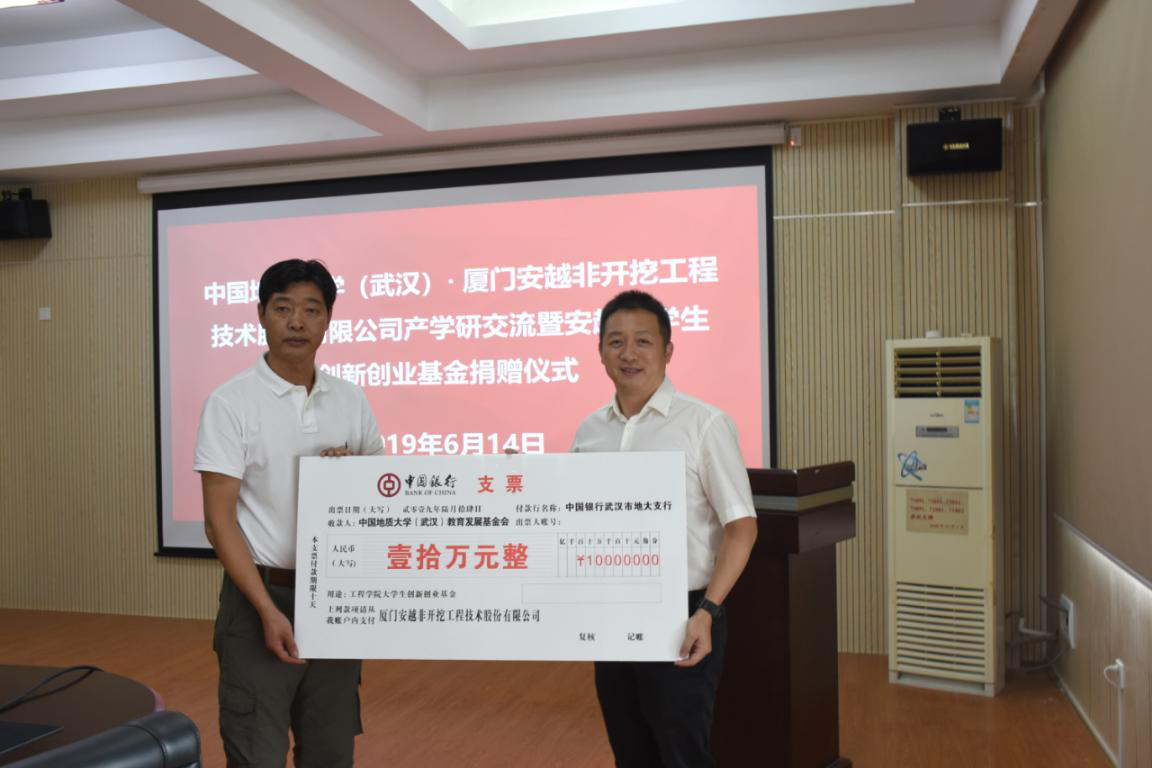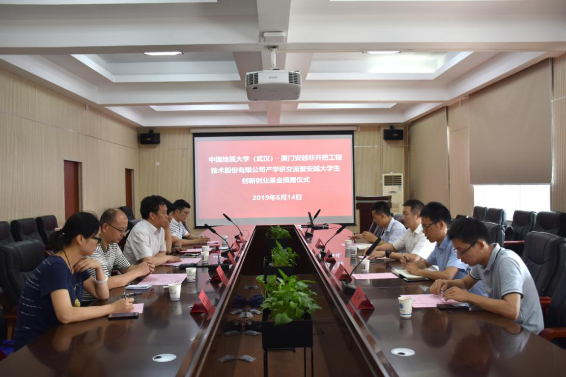 2019年6月14日上午,厦门安越非开挖技术股份有限公司来校作产学研交流,并捐赠10万设立安越大学生创新创业基金,捐赠仪式在315举行。厦门安越非开挖技术股份有限公司董事长廖宝勇一行、武汉中地大非开挖研究院有限公司总经理孔耀祖,校友工作与教育基金管理处副处长吕占峰、丁苗苗,beat365正版唯一官网党委书记陈飞、党委副书记江广长、副教授曾聪参加会议。江广长主持会议。