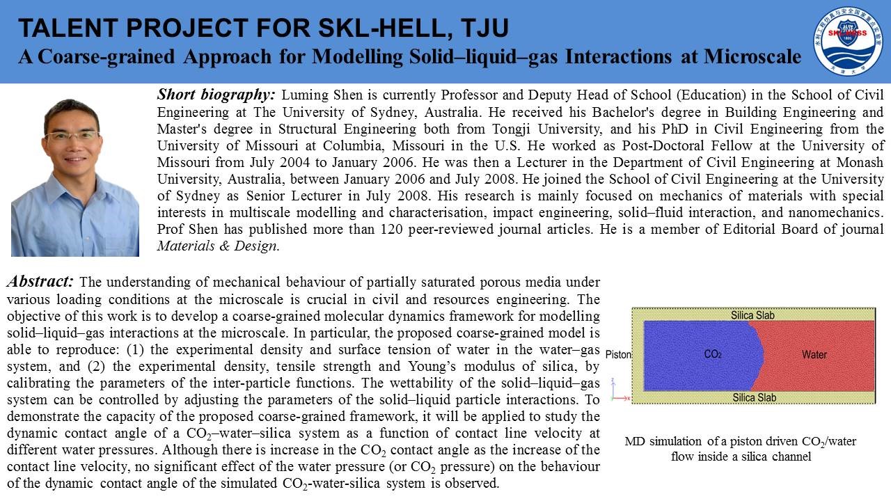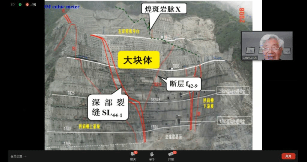 beat365正版唯一官网院长焦玉勇教授作为国际岩石力学与岩石工程学会非连续变形分析专委会主席牵头组织并主持了此次云论坛会议,石根华教授基于数十年的关键块体理论研究工作,介绍了关键块体理论的发展、基本原理及采用赤平投影方法将2D关键块体理论拓展的3D关键块体理论,并且用多个实际工程演示了关键块体理论的坝基、硐室分析应用;赵坚教授以岩石动力学实验及实验设备为出发点,简述了霍普金森杆(SHPB)在高加载率动力学实验中的应用和真三轴SHPB的发展过程及其特性与应用领域;沈鲁明教授以气-液-固一体化微观数值计算方法为核心,介绍了CGMD(coarse-grained molecular dynamic)数值方法,详细阐述了CGMD中多相相互作用关系,并以数值实验对CGMD进行验证,最后介绍了CGMD方法模拟CO2-水-SiO2系统各相介质之间的相互作用。