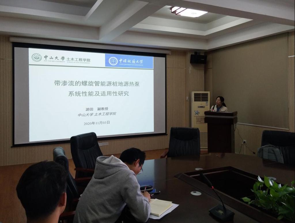 2020年11月3日下午,应beat365正版唯一官网骆进副教授邀请,中山大学游田副教授作客工程文化论坛,在315会议室作了题为“带渗流的螺旋管能源桩地源热泵系统性能及其适用性研究”的学术报告。骆进副教授主持了此次论坛活动,学院50余名师生聆听了学术报告。