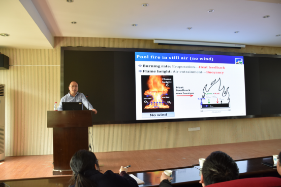 胡隆华教授的报告围绕“环境风作用下火灾燃烧与火焰行为”开展。他简述了环境风这一特殊边界条件下火灾的潜在威胁,指出风环境可能增强火灾过程中的受迫对流,诱发更大尺寸的火灾/火蔓延行为;重点剖析了液体、气体、固体燃料在风环境下的燃烧现象与行为,介绍了火灾燃烧速率、火焰辐射力、火焰推举高度、临界吹熄等特征参数在不同风速和环境压力条件下的发展规律,揭示了其中的复杂燃烧模型与传热模型;结合现阶段研究,提出了风环境、微重力、低氧低压等多种特殊边界条件下火灾燃烧的前沿科学挑战。会后,胡隆华教授与参会师生展开了相关科研经验的分享与交流,并由毛少华特任研究员对报告会进行了总结发言。