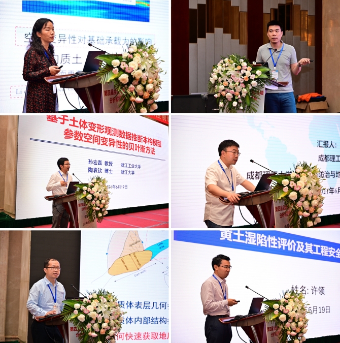 会议期间,各位专家学者以目前各自所属的专业方向及具体研究成果为主要内容,为线下线上参会人员作了精彩的学术报告。beat365正版唯一官网(武汉)唐辉明教授以《基于演化的滑坡防控理论与方法技术》为题作会议特邀报告,美国克莱姆森大学C. Hsein Juang教授在线上作《地质/地层/岩土模型不确定性的量化及影响评价》的特邀报告,同济大学黄宏伟教授以《工程风险管控存在的问题与适应性风险管理》为题作特邀报告,武汉大学李典庆教授以《Copula理论在岩土工程不确定性与可靠性分析中应用进展》为题作特邀报告,重庆大学周小平教授以《场富集有限元法及其应用》为题作特邀报告,中国大地保险张帆总经理应邀以《IDI的实践与思考》为题作特邀报告。