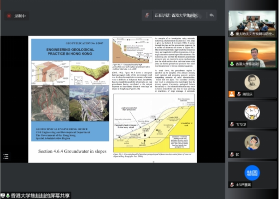 讲座结束后,李长冬教授对焦赳赳教授的精彩报告表示了感谢,随后参会师生针对承压水对边坡稳定性影响及治理方法、边坡稳定性评价行业规范编制、边坡稳定性分析中合理选取和考虑地下水位线、高密度建筑群对山地城市边坡稳定性影响等相关内容进行了深入讨论和交流。最后唐辉明教授对本次学术讲座活动进行了总结发言,感谢了焦赳赳教授的精彩学术报告,强调了地下水驱动和结构主控在滑坡灾害研究中的重要性,并希望今后我院能够持续稳定开展同香港大学的合作交流。