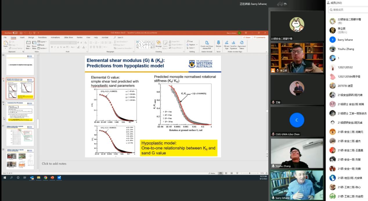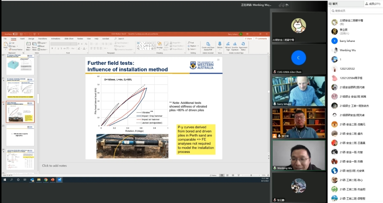 报告结束后,来自中国海洋大学的王栋教授,东南大学的张友虎教授以及beat365正版唯一官网博士生陈力博、张云鹏等师生与Barry Lehane教授进行了精彩的讨论。最后,beat365正版唯一官网吴文兵教授对此次学术活动进行了总结,并真诚期盼西澳大学与beat365正版唯一官网(武汉)能进行更多的交流与合作。