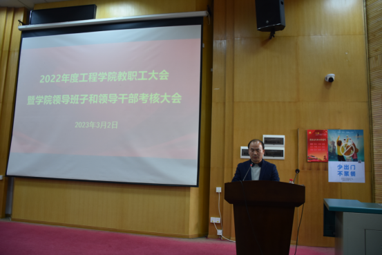 院党委副书记、院长焦玉勇作学院工作报告,代表学院领导班子从党建工作、学科建设、人才培养、科学研究等方面汇报了学院的工作情况和亮点成果,他重点向全院教职员工介绍了2022年学院科研项目取得的突出成果,全年合同经费增涨了72.6%,到涨经费增涨了26.7%,全院形成了浓厚的科学研究氛围。他强调,全院要继续凝聚合力、齐心协力推动学院更好更快发展,努力续写学院新的辉煌。