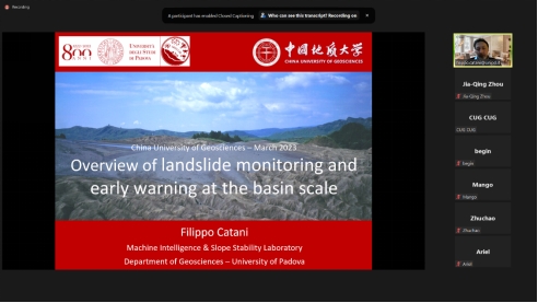 (通讯员:陈文强 叶阳)3月20日至22日,应我院唐辉明教授和李长冬教授的邀请,意大利帕多瓦大学Filippo Catani教授应邀作客2023年度第1-3期“重大地质灾害预测与防控学科”111创新引智基地系列学术讲座。系列短课采用Zoom在线会议形式,由叶阳特任教授主持,李长冬教授、周佳庆特任教授、张峰特任教授、邹宗兴副研究员等共计40余名师生参加了本次在线短课。