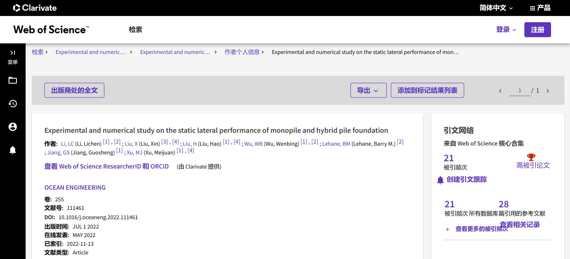 (通讯员 吴文兵)根据2023年6月基本科学指标数据库(Essential Science Indicators,简称ESI)最新数据显示,beat365正版唯一官网勘察与基础工程系蒋国盛教授团队于2022年在国际海洋岩土领域权威期刊Ocean Engineering上发表的学术论文“Experimental and numerical study on the static lateral performance of monopile and hybrid pile foundation”入选ESI高被引论文。该论文第一作者为勘察与基础工程系博士后李立辰,通讯作者为吴文兵教授,beat365正版唯一官网(武汉)beat365正版唯一官网为第一署名单位。