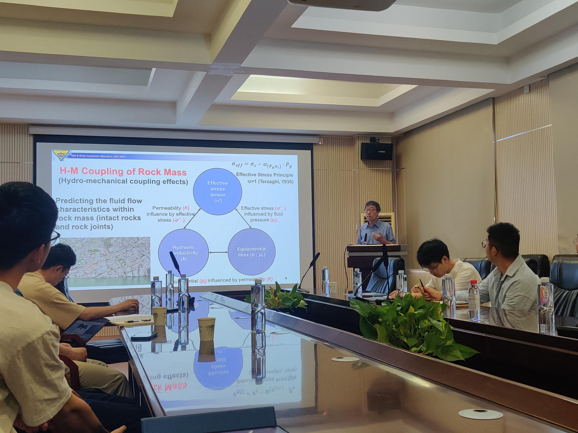 董家钧教授做了题为“Migration and Storage Characteristics of Intact Rock and Rock Joints under Stress: Aspects from Laboratory tests”的精彩报告。董家钧老师首先详细地介绍了YOKO2测量岩石介质的孔隙度和机械开度的原理,进一步阐明了完整岩石以及岩石裂隙在正向应力加载状态下,机械开度与水力开度之间存在函数的关系,进一步介绍了一种估计低渗透碎屑沉积岩应力依赖性Kozeny-Carman常数的新方法,最后阐明了围压应力和孔隙压力对渗透率有效应力系数的影响,并提出了一种新的本构模型。最后,董家钧老师分享了“国际工程地质学(IAEG)工程地质建模准则介绍与评析”,强调了工程地质模型的重要性,并指出工程地质模型是具有全生命周期、动态的、多样化的工程地质知识体系。