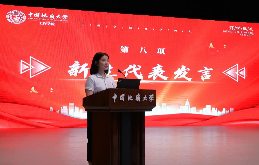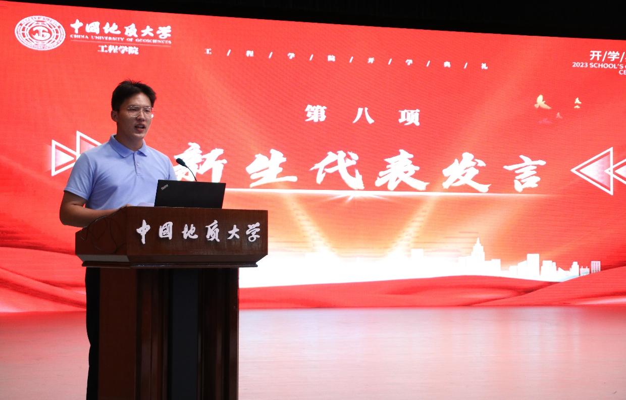 2023级05D231班张高涵同学作为本科生新生代表发言。他说,在长辈厚重岩土气息的熏陶下,自己终于如愿考进地质大学,加入beat365正版唯一官网。他对开学报到以来学院领导老师给予的教育关怀表示感谢,对军事训练当中空军预警学院教官对自己坚忍毅力和良好作息的打造由衷感激,他立志与其他505名本科新生同学一道,以强国建设、民族复兴的时代号召为号角,以“品德高尚、基础厚实、专业精深、知行合一”的成才目标为向导,直挂云帆,乘风破浪,早日成为德智体美劳全面发展的中国特色社会主义事业的建设者和接班人。