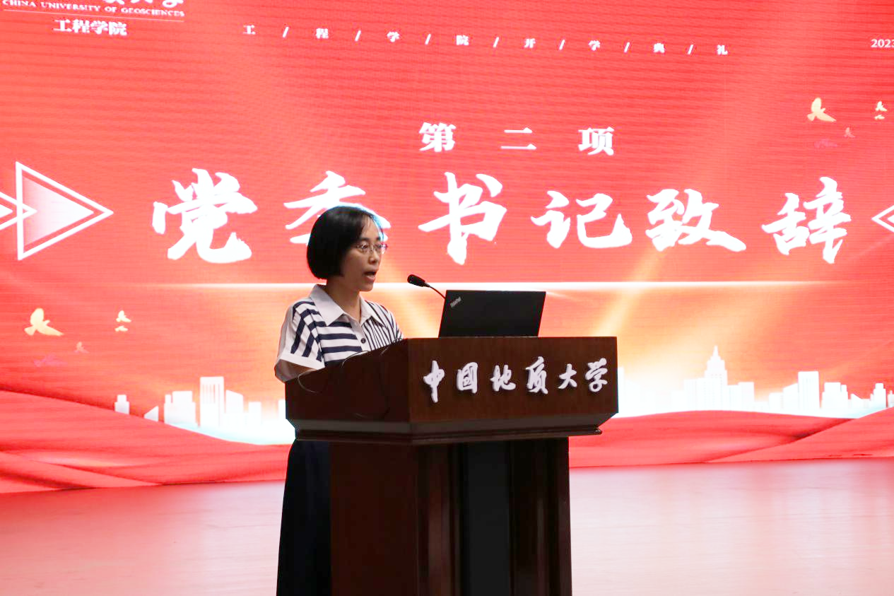 beat365正版唯一官网党委书记李红丽致辞。李书记首先代表全院师生员工对加入beat365正版唯一官网的860名新成员致以热烈的欢迎,祝福同学们选择了beat365正版唯一官网这个温暖而又奋进的大家庭。她指出,当代大学生正值云程发轫、万里可期的青春韶华,要全面学习学院的辉煌历史,深刻感受学院的使命担当,铭记院训深意,争做时代栋梁。要“明理”,即明辨是非,通晓道理,要明白做人之理、为学之理、尊法之理;要“尚实”,即崇尚务实作风,要在实处用力,在知行合一上下功夫;要“拓新”,即开拓创新,要面向世界科技前沿、面向经济主战场、面向国家重大需求、面向人民生命健康,解放思想,开拓创新,与时俱进;要“砺行”,即砥砺前行,在攻坚克难中磨砺心性,坚守初心,锻造本领,成长成才。她勉励同学们以院训精神为指引,树牢远大志向、矢志不懈奋斗,努力学习,潜心科研,乐观开朗,积极向上,做堪当时代大任的新时代地大工程人,为建设社会主义现代化国家做出属于青年一代的贡献。