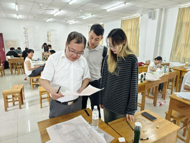 王亮清等一行来到教室看望学生,他细心指导同学们进行实习地层剖面实测与剖面图柱状图的制图,与同学们交流实习的所感所获,他表示,周口店实践教学基地被誉为“地质工作者的摇篮”和“天然的地质百科全书”,在实习站走过的70年光辉历程中,无数的地大师生曾在这里同吃、同住、同学、同研,不仅培养了一批批地质领域的拔尖创新人才,更孕育出“山河为师、启智育德、力行悟道、地质报国”的摇篮精神,希望全院实习生以地质前辈为榜样,以摇篮精神为指引,紧扣国家地质人才战略需求和学校地质工程专业人才培养方案,将课堂学习和野外实习深度融合,在一锤一锤的磨砺里和一步一步的攀登中感悟历史荣光、收获时代成长,通过学习和实践提高站位、拓宽视野、创新思路、解决问题,争做有理想、敢担当、能吃苦、肯奋斗的新时代地质工程好青年。
