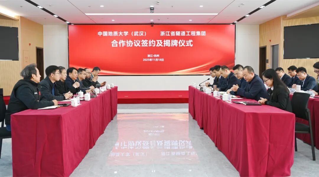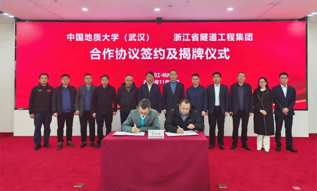 beat365正版唯一官网(武汉)与浙江省隧道工程集团有限公司正式签订《研究生联合培养基地合作协议》与《产学研合作协议》,举行了“研究生联合培养基地”和“地质e站”揭牌仪式,开启了校企合作新篇章。
