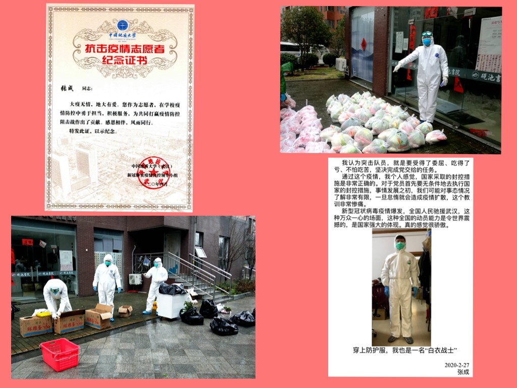 实验中心党支部组织、纪检委员张成同志,在得知学校疫情防控人员紧张,组建志愿者服务队时,主动请缨报名参加了第一批志愿者突击队,承担起包括南望山庄、喻家山庄、东区家属楼的疫情防控工作。随着疫情的严重,封控的措施也不断地升级。突击队主要工作在疫情最严重的一线,就是重点封控楼栋,主要工作比较琐碎:完成楼栋内药品需求和快递拿取信息统计汇总;把住户购买的生活物资、急需药品和快递按户统一,集中转运到各位老师的家门口;垃圾清运、煤气、水卡等充值配送等;必要的时候还给住户要耐心宣传国家政策,安抚情绪。大疫无情,地大有爱!张成同志在学校抗疫工作中,冲锋在前、勇于担当,风雨兼程,舍小家为大家,为共同打赢疫情防控阻击战作出了突出贡献!他在2020年2月27日的随笔中写道:穿上防护服,我也是一名白衣战士!